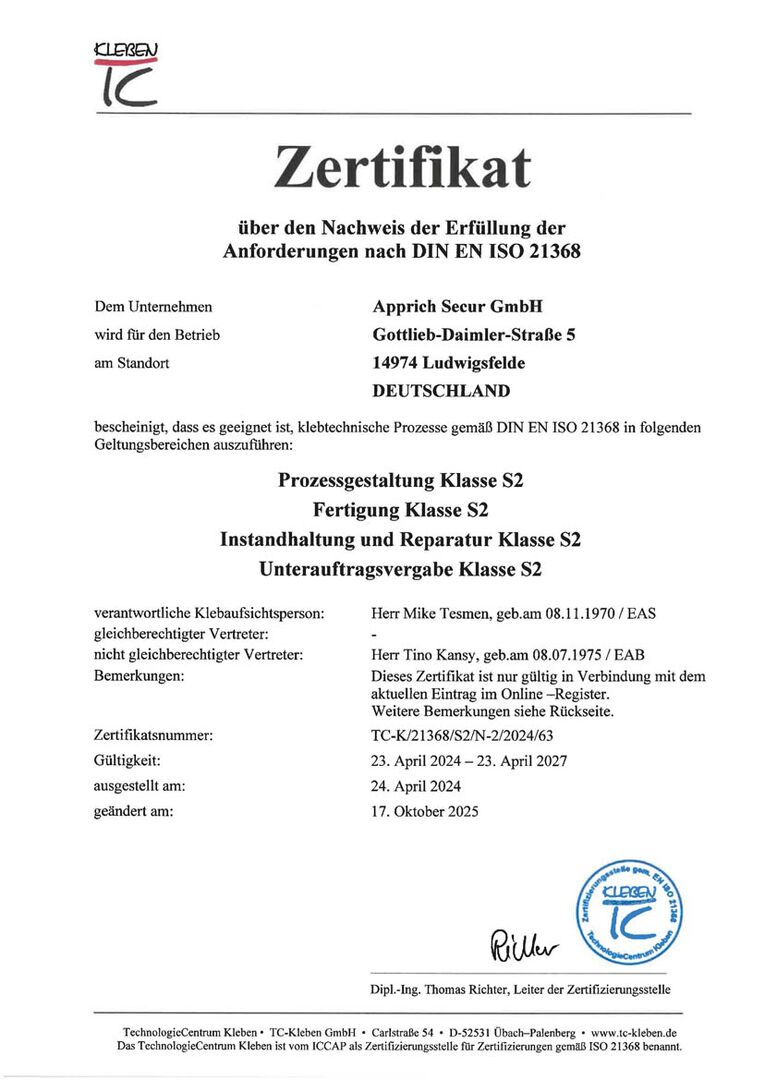 Darüber hinaus haben wir uns zum Klebefachbetrieb nach DIN 2304 und nach TL A-0023 zertifizieren lassen. Wir sind demnach legitimiert klebetechnische Prozesse in folgenden Geltungsbereichen durchzuführen: